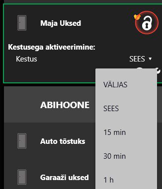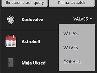 - Kuller – Kullerfunktioon võimaldab teil võtta vastu pakki kui te samaaegselt pole kodus. Kullerfunktsiooni valimisel avaneb välis-/garaaži- või panipaiga uks etteantud ajaks võetakse maha ainult selle ruumi valve ( ülejäänud ruumide valve jääb ).